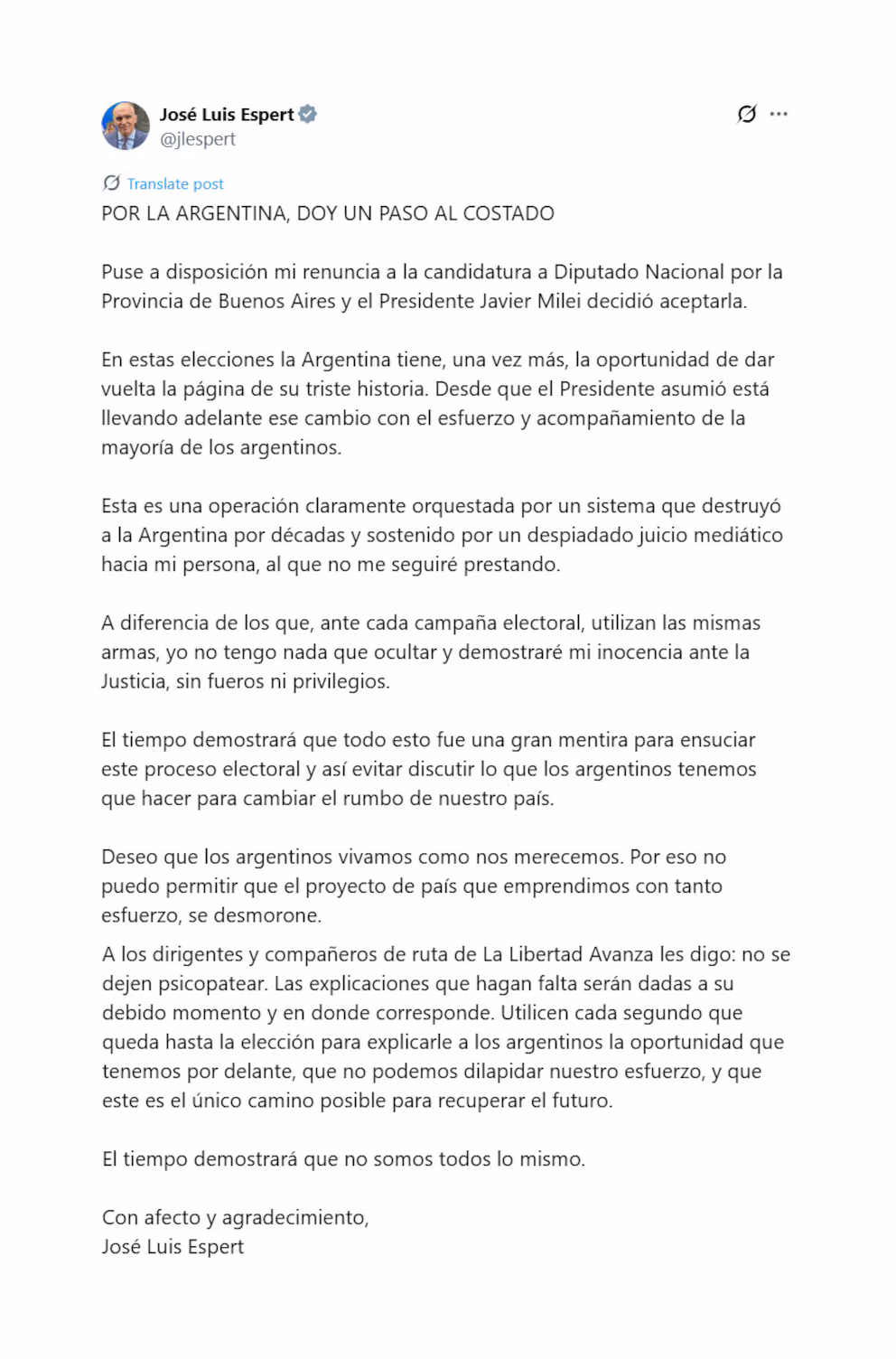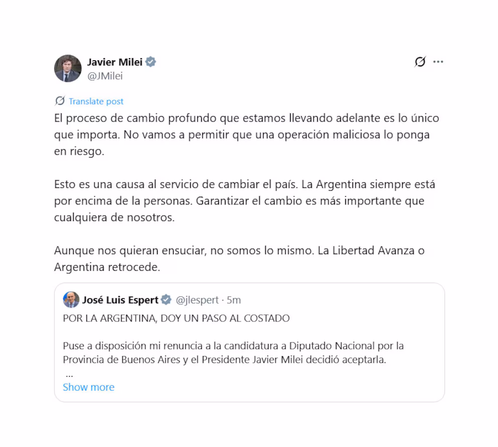 Casi en simultáneo, el presidente compartió el mensaje del ahora ex candidato Espert y también expuso sus motivos. “El proceso de cambio profundo que estamos llevando adelante es lo único que importa. No vamos a permitir que una operación maliciosa lo ponga en riesgo”, indicó.