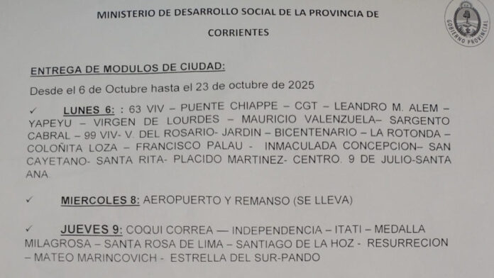 La Delegación Goya de Desarrollo Social informa el cronograma de entrega de módulos alimentarios desde el 6 de octubre hasta el 23 de octubre de 2025. Los módulos se entregarán únicamente en las fechas indicadas en el cronograma. Sin excepciones, presentarse con DNI