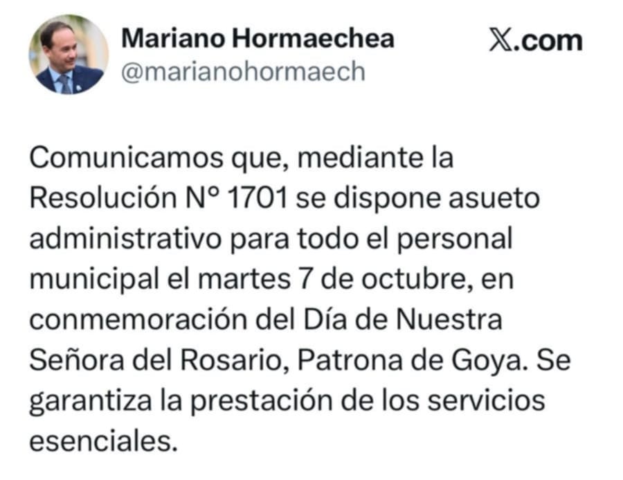 El jefe comunal Mariano Hormaechea manifestó: “Comunicamos que, mediante la Resolución N° 1701 se dispone asueto administrativo para todo el personal municipal el martes 7 de octubre, en conmemoración del Día de Nuestra Señora del Rosario, patrona de Goya. Se garantiza la prestación de los servicios esenciales”.