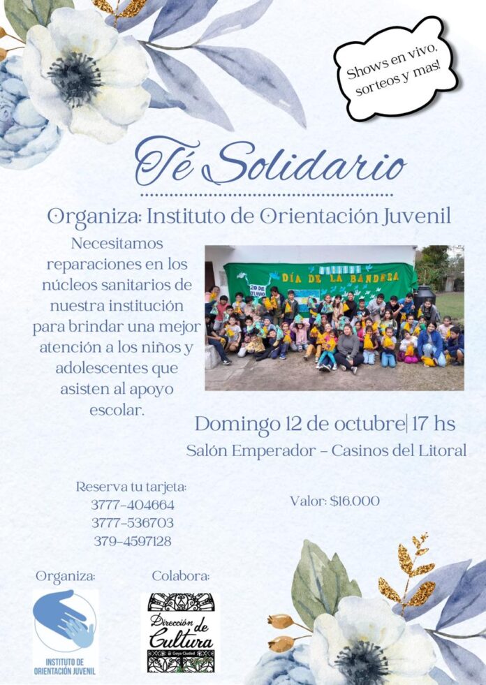 Con el objetivo de recaudar fondos para reparar los núcleos sanitarios de su edificio, el Instituto de Orientación Juvenil organiza este domingo 12 de octubre, a partir de las 17 horas, un Té Solidario en el Salón Emperador del Casino del Litoral. El valor de la tarjeta es de $16.000 e incluye servicio de té, pastelería, shows en vivo y sorteos. Las reservas pueden realizarse a los teléfonos 3777-404664, 3777-536703 o 3794-597128.