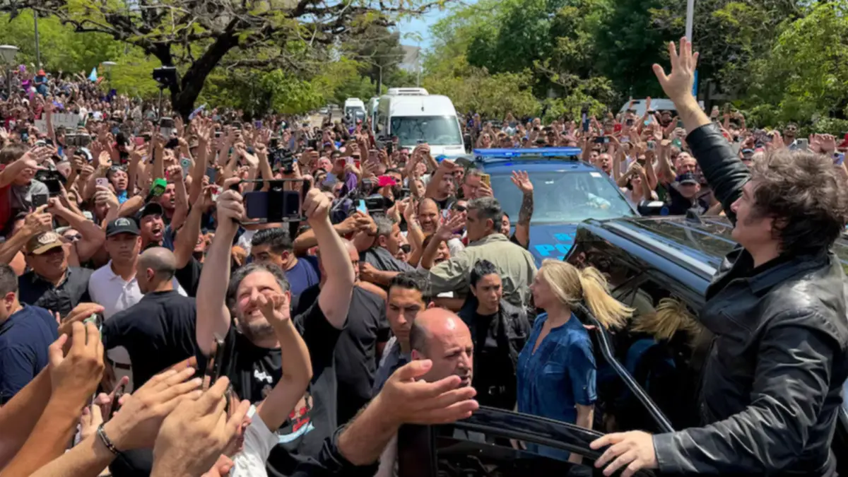 Cerca de las 12, el presidente Milei llegó a la esquina de la plaza Belgrano, en el cruce de las calles French y Paraguay, en el medio de un fuerte operativo de seguridad coordinado entre las fuerzas federales y la policía local. Inicialmente, se apeó y comenzó a saludar a la multitud, pero luego se colocó en la caja trasera de una camioneta que integraba la caravana y allí recorrió un tramo del camino acompañado por su hermana Karina, quien llevaba en sus manos un peluche de un león que le arrojaron desde la calle.