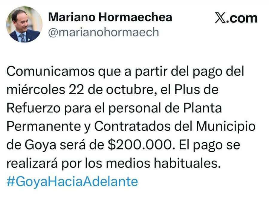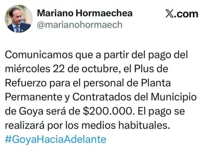 En sus redes, informa: “Comunicamos que, a partir del pago del miércoles 22 de octubre, el Plus de Refuerzo para el personal de Planta Permanente y Contratados del Municipio de Goya será de
