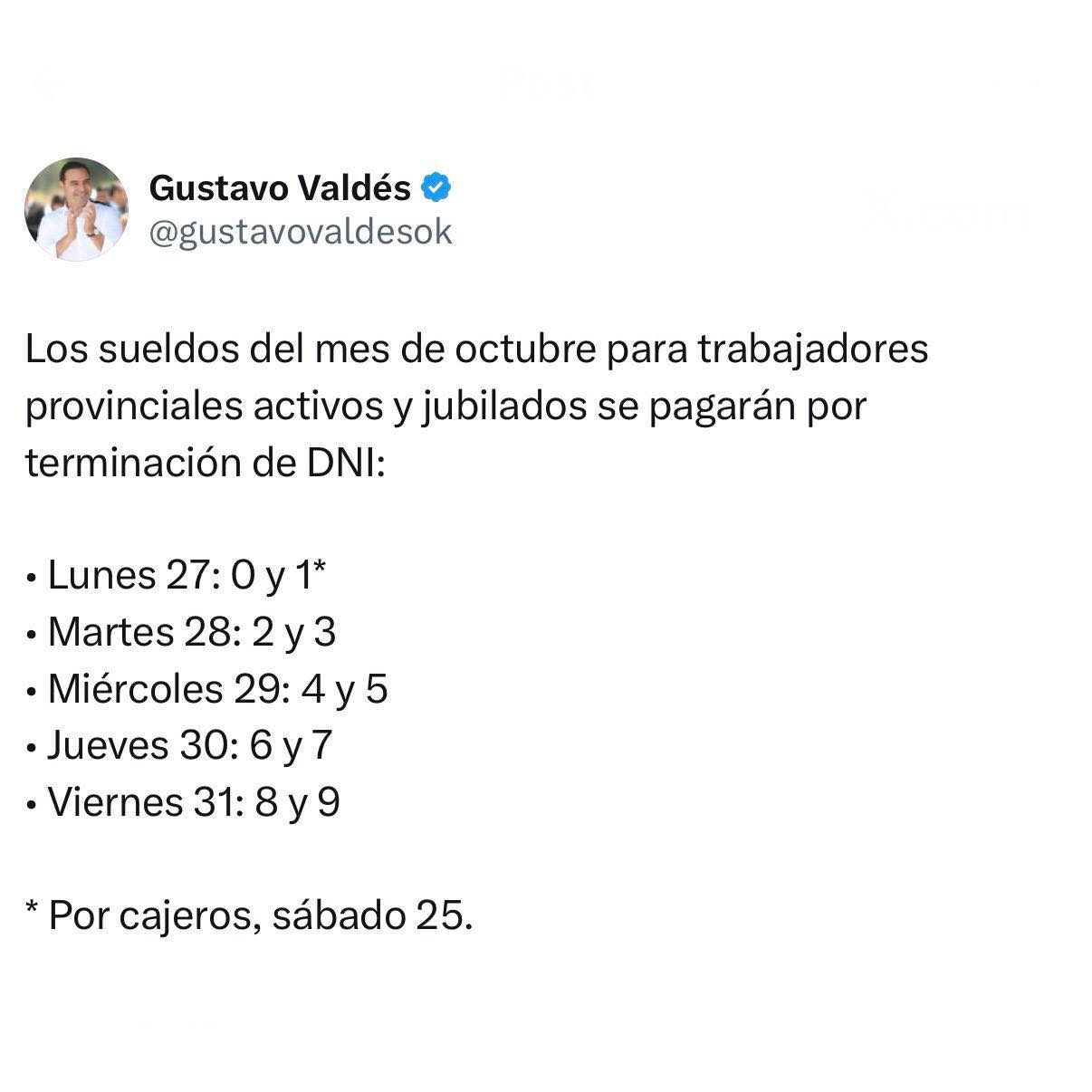 El gobernador de Corrientes, Gustavo Valdés, confirmó las fechas del cronograma de pago de sueldos para los trabajadores de la administración pública provincial, incluyendo tanto a estatales activos como a jubilados y pensionados.