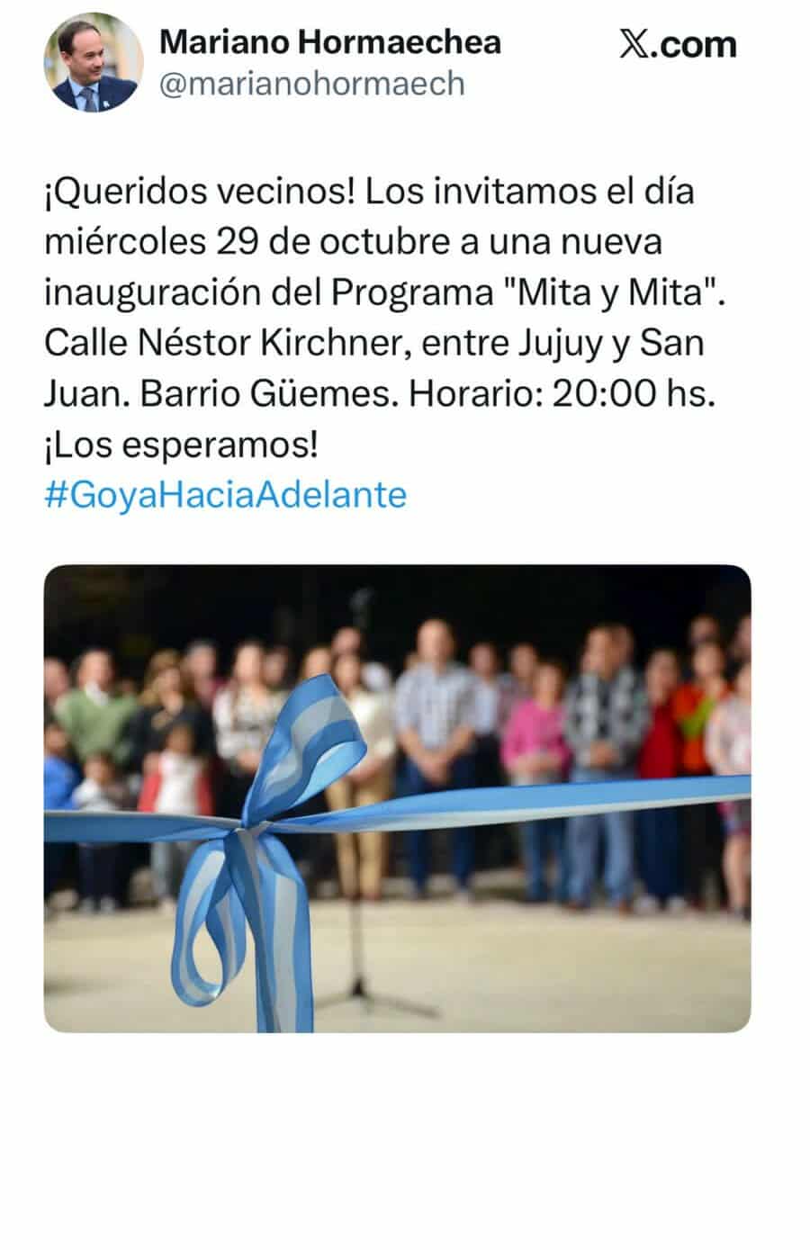 En su mensaje, el jefe comunal de Goya doctor Mariano Hormaechea expresó: “¡Queridos! Los invitamos el día miércoles 29 de octubre a una nueva inauguración del Programa “Mita y Mita”. Calle Néstor Kirchner, entre Jujuy y San Juan. Barrio Güemes. Horario 20:00 hs. ¡Los esperamos! #GoyahaciaAdelante