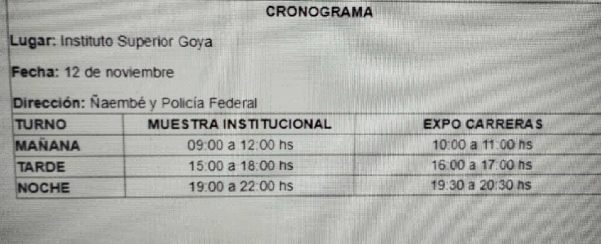 El Instituto Superior Goya invita a la comunidad a participar de su Muestra Institucional y Expo Carreras 2025, que se realizará el miércoles 12 de noviembre en la sede del Instituto, ubicada en Calle Ñaembé y Policía Federal.