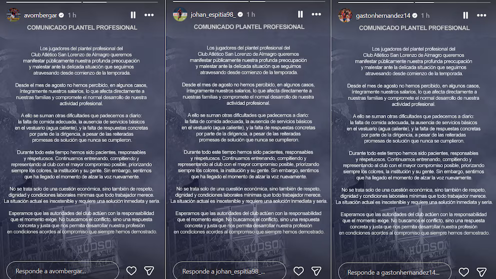 “Los jugadores del plantel profesional del Club Atlético San Lorenzo de Almagro queremos manifestar públicamente nuestra profunda preocupación y malestar ante la delicada situación que seguimos atravesando desde comienzo de la temporada.