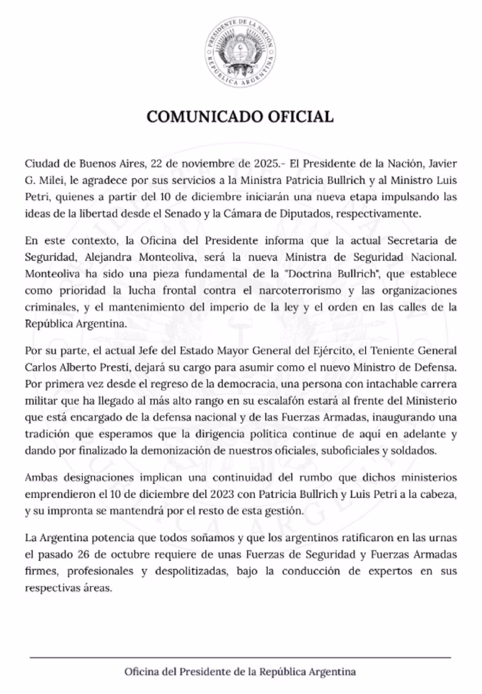 En simultáneo, la decisión fue comunicada por Bullrich, Petri y la Oficina del Presidente en la red social X. “El Presidente de la Nación, Javier G. Milei, le agradece por sus servicios a la Ministra Patricia Bullrich y al Ministro Luis Petri, quienes a partir del 10 de diciembre iniciarán una nueva etapa impulsando las ideas de la libertad desde el Senado y la Cámara de Diputados”, comienza el comunicado, en el que el Gobierno asegura que “ambas designaciones implican una continuidad del rumbo”.