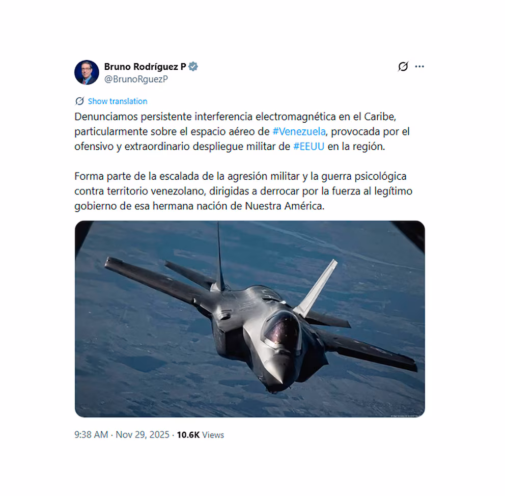 “Denunciamos persistente interferencia electromagnética en el Caribe, particularmente sobre el espacio aéreo de Venezuela, provocada por el ofensivo y extraordinario despliegue militar de EEUU en la región”, escribió el funcionario en su cuenta en la red social X.