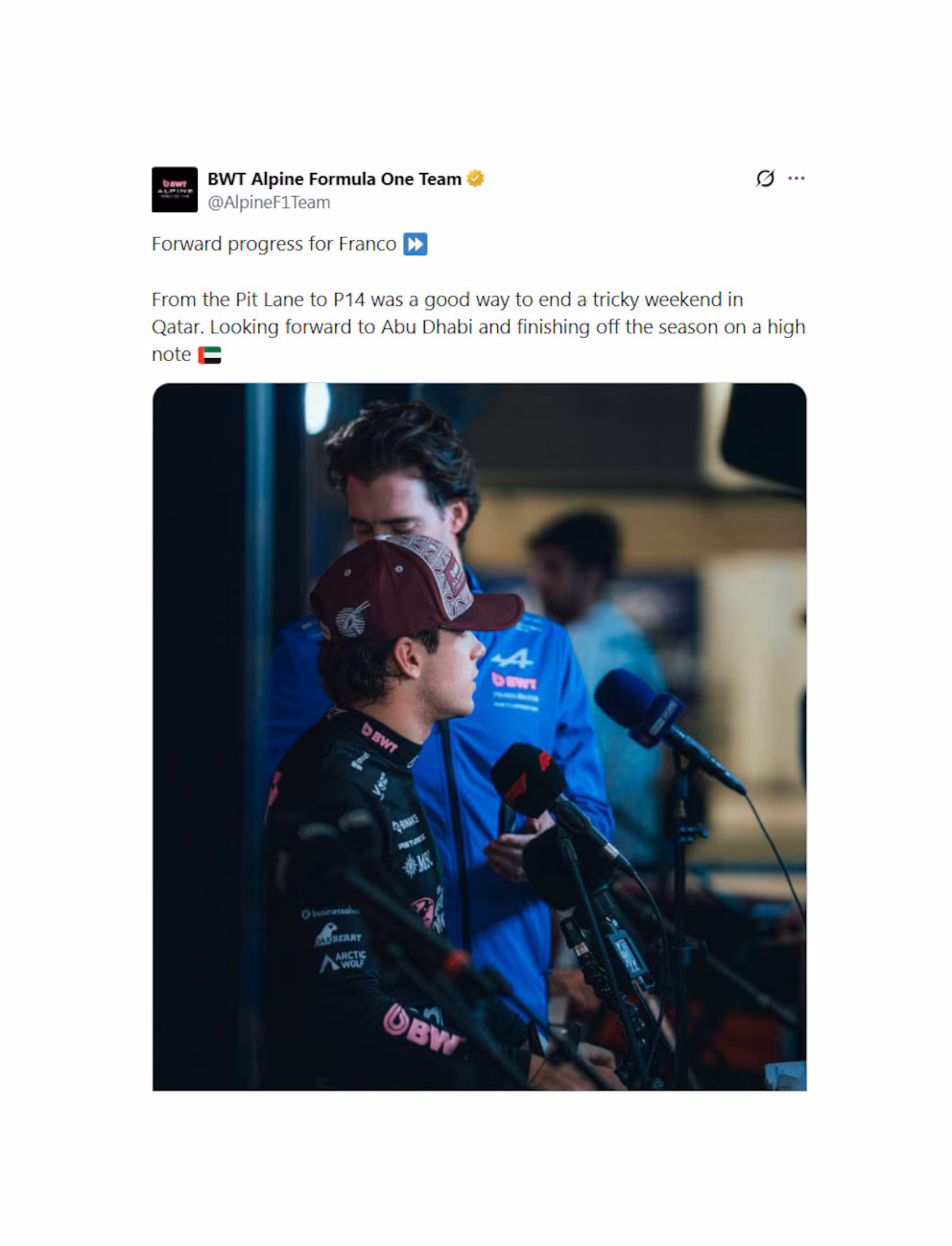 Tras la carrera, Alpine ponderó el rendimiento del pilarense con un posteo en redes sociales. “Avances para Franco. Desde el pit lane hasta la 14.ª posición, fue una buena manera de terminar un fin de semana complicado en Catar. Deseando llegar a Abu Dabi y terminar la temporada con broche de oro”, escribió el equipo junto a una foto de Colapinto en rueda de prensa.