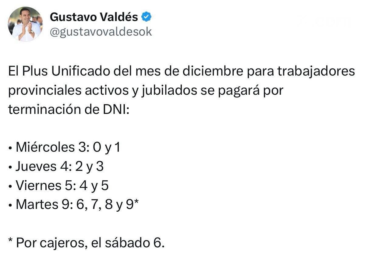 El Gobierno de Corrientes confirmó el Plus Unificado correspondiente al mes de diciembre para trabajadores provinciales, tanto activos como jubilados. El anuncio lo hizo gobernador Gustavo Valdés a través de su cuenta de X.