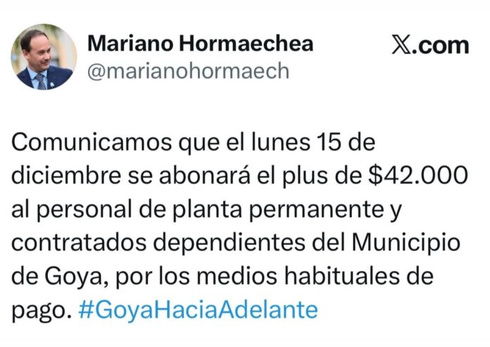 En su mensaje, el jefe comunal Hormaechea expresó: “Comunicamos que el lunes 15 de diciembre se abonará el plus de $42.000 al personal de Planta Permanente y Contratados dependientes del Municipio de Goya, por los medios habituales de pago. #GoyaHaciaAdelante”