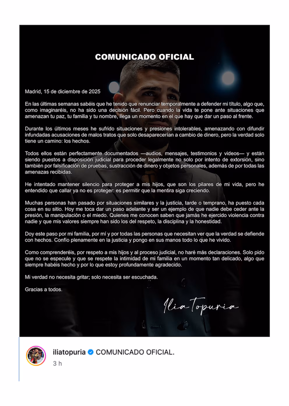 “He intentado mantener silencio para proteger a mis hijos, que son los pilares de mi vida, pero he entendido que callar ya no es proteger: es permitir que la mentira siga creciendo”, declaró Topuria en el texto difundido a la prensa. El deportista hizo referencia, además, a personas que han vivido situaciones similares, y remarcó su confianza en la actuación judicial: “Muchas personas han pasado por situaciones similares y la justicia, tarde o temprano, ha puesto cada cosa en su sitio”.