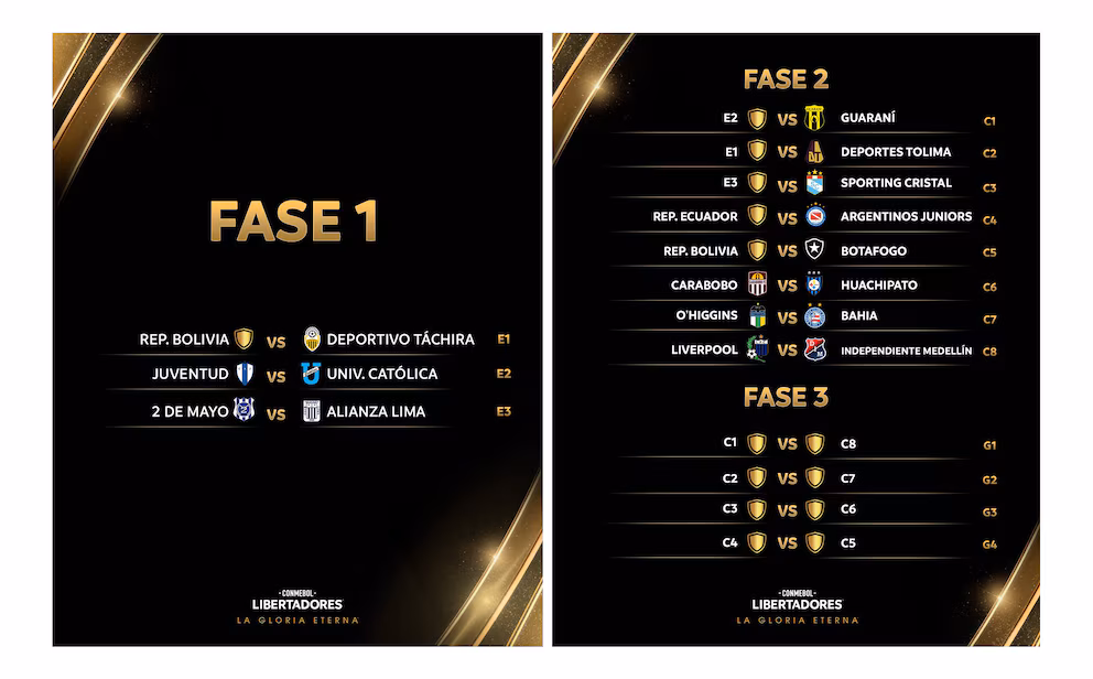 La metodología del sorteo se fundamentó en criterios de ranking, con el objetivo de asegurar la transparencia y la equidad en la conformación de los enfrentamientos. En el caso de la Copa Libertadores, la Fase 1 estuvo compuesta por seis equipos: Alianza Lima (Perú), Deportivo Táchira (Venezuela), Universidad Católica (Ecuador), un representante de Bolivia aún por definir, 2 de Mayo (Paraguay) y Juventud (Uruguay). Estos clubes competirán por tres plazas para la Fase 2, y los ganadores de cada llave avanzarán identificados como E1, E2 y E3, completando así el grupo de 16 equipos que disputarán la siguiente etapa.