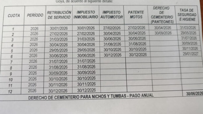 Fijando calendario impuestos automotor, inmobiliario, retribución de servicios, patente motos, tasa seguridad e higiene y derecho cementerio – año 2026
