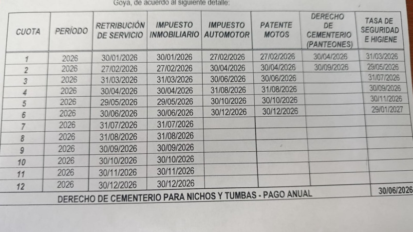 ARTÍCULO 1º: FIJAR el siguiente Calendario de Vencimientos para aquellos tributos cuya determinación, recaudación y fiscalización se encuentren a cargo del Municipio de Goya, de acuerdo al siguiente detalle: