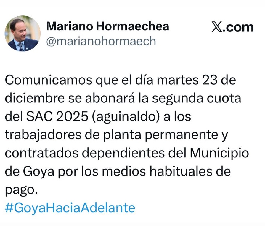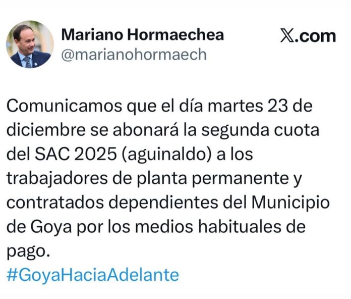 Hoy martes 23 de diciembre la Municipalidad de Goya efectivizó el pago del medio aguinaldo para el personal de Planta Permanente y Contratados, este anuncio lo realizó el Intendente Mariano Hormaechea a través de su cuenta oficial.