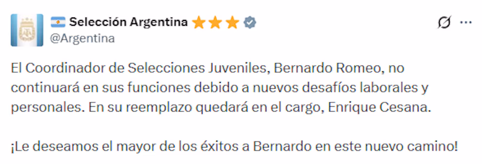 Infobae anticipó el alejamiento de Romeo del cargo, que todavía no tenía un reemplazo confirmado. Sin embargo, el entorno de la selección argentina dejó el misterio a un lado y, en las horas previas a la Navidad, oficializó el cambio de funciones a través de sus canales oficiales. “El Coordinador de Selecciones Juveniles, Bernardo Romeo, no continuará en sus funciones debido a nuevos desafíos laborales y personales. En su reemplazo quedará en el cargo, Enrique Cesana. ¡Le deseamos el mayor de los éxitos a Bernardo en este nuevo camino!”, escribieron a través de una publicación en su perfil de X (antes, Twitter).