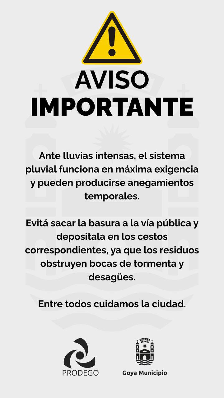 Desde el Municipio se insta a la población a tomar recaudos frente a eventos climáticos, evitando sacar la basura a la vía pública y depositándola en los cestos correspondientes. Durante lluvias intensas, el sistema pluvial trabaja en condiciones de máxima exigencia y puede verse afectado por factores externos, como la obstrucción de bocas de tormenta, canales y estaciones de bombeo, lo que podría generar anegamientos temporales.