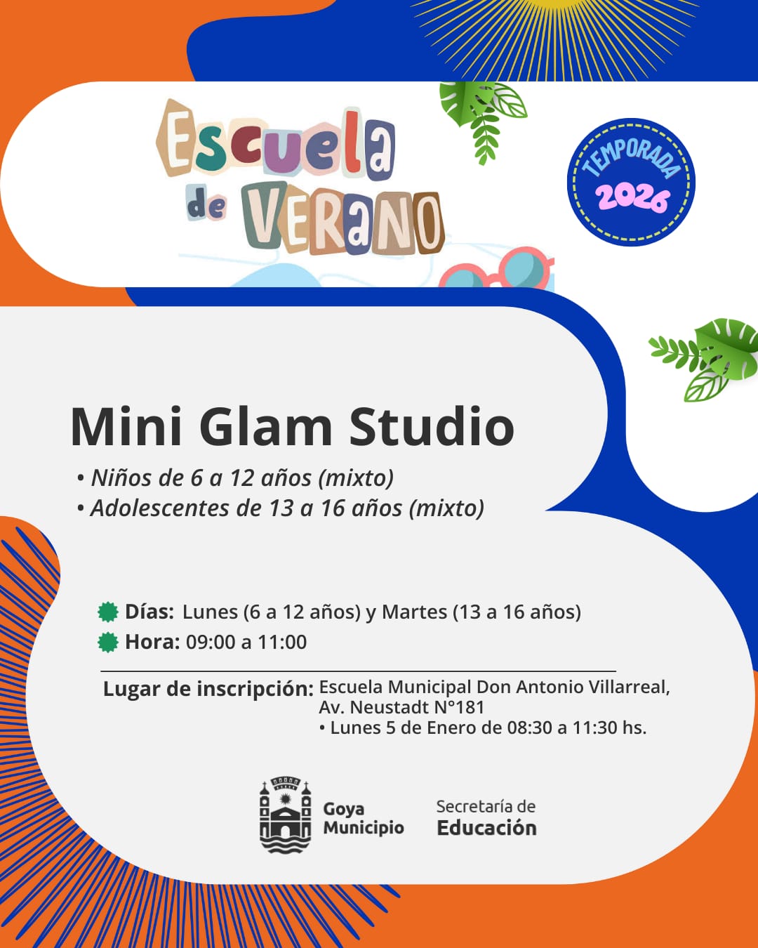 MINI GLAM STUDIO: Para niños y niñas de 6 a 12 años y adolescentes (mixtos) de 13 a 16 años, los días lunes de 9 a 11 horas para los niños y niñas de 6 a 12 años y martes de 9 a 11 horas para los adolescentes (mixtos) de 13 a 16 años, en la Escuela Antonio R Villarreal.