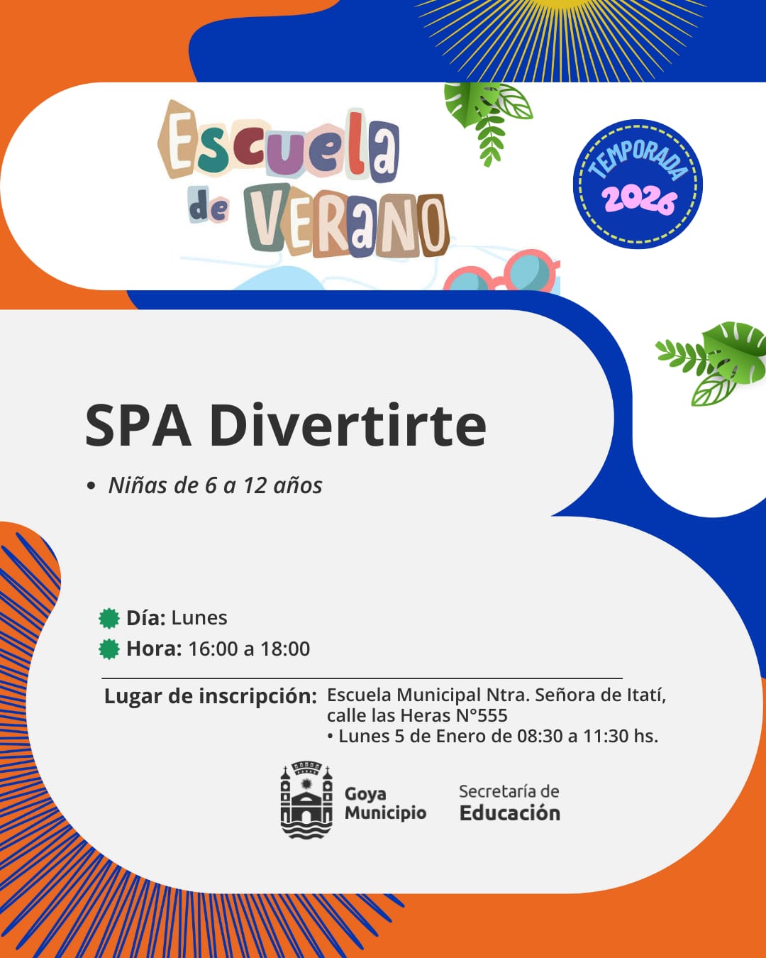 SPA-DIVERTIRTE: Para niñas de 6 a 12 años, los días lunes de 16 a 18 horas; en la Escuela Nuestra Señora de Itatí y martes de 16 a 18 horas en la Escuela Antonio R Villarreal.