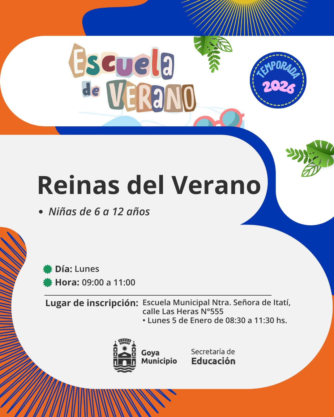 REINAS DEL VERANO: Para niñas de 6 a 12 años, los días lunes de 9 a 11 horas, en la Escuela Nuestra Señora de Itatí