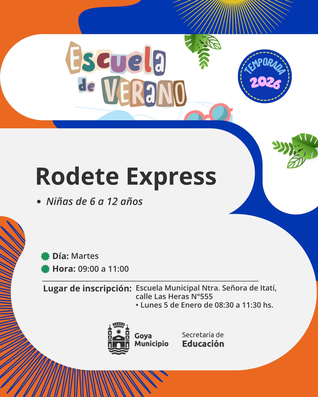 RODETE EXPRÉS: Para niñas de 6 a 12 años, los días martes de 9 a 11 horas, en la Escuela Nuestra Señora de Itatí.