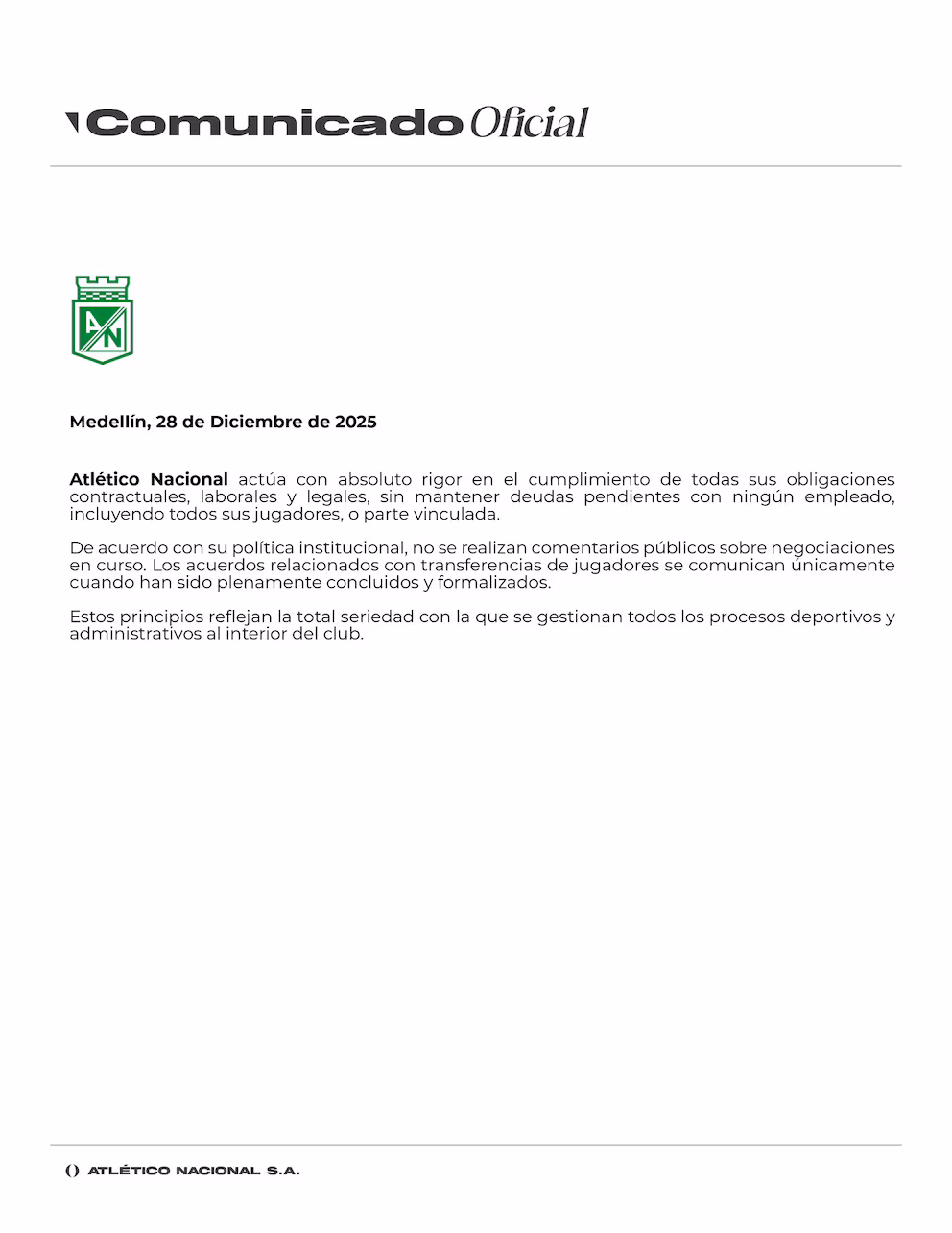 El Xeneize, que ya tendría acordado de palabra el contrato con el extremo de 23 años, estaría trabajando en una operación cercana a los 5 millones de dólares para quedarse con el colombiano. Sin embargo, pasan los días y la oficialización del traspaso sigue sin aparecer. En medio de la dilatación de las negociaciones, el Verde lanzó un duro mensaje oficial con el objetivo de desmentir las versiones que indican una presunta deuda. “Atlético Nacional actúa con absoluto rigor en el cumplimiento de todas sus obligaciones contractuales, laborales y legales, sin mantener deudas pendientes con ningún empleado, incluyendo todos sus jugadores, o parte vinculada”, detalló la entidad.