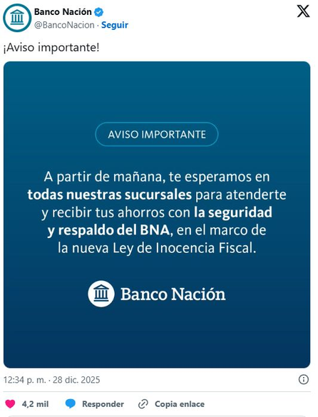 “De acuerdo a la Ley de Inocencia Fiscal recientemente aprobada, el Banco Nación, a través de sus más de 700 sucursales y canales digitales, está preparado para satisfacer la demanda de sus clientes y de toda aquella persona interesada a la hora de hacer consultas o solicitar nuestro servicio para disponer de sus ahorros”, publicitaron en un mensaje que repostea el de Caputo.