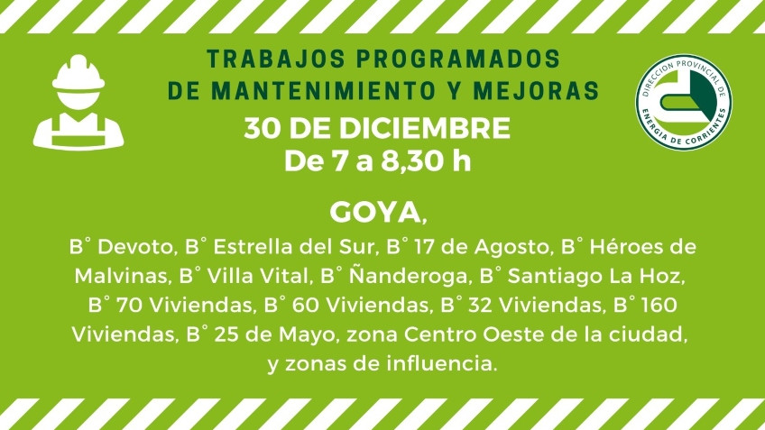 La Dirección Provincial de Energía de Corrientes informa que se realizarán trabajos programados de mantenimiento y mejoras en la ciudad de Goya, este martes 30 de diciembre de 07,00 a 08,30 horas en barrios: Devoto, Estrella del Sur, 17 de agosto, Héroes de Malvinas, Villa Vital, Ñanderoga, Santiago La Hoz, 70 Viviendas, 60 Viviendas, 32 Viviendas, 160 Viviendas, 25 de Mayo, zona centro Oeste de la ciudad y zonas de influencia.