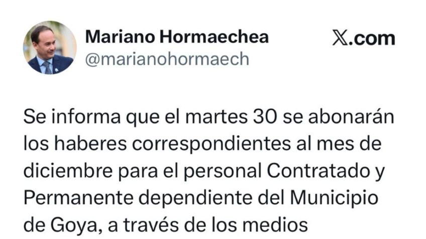 El Intendente de Goya, doctor Mariano Hormaechea, anunció a través de sus redes personales que este martes 30 de diciembre de 2025 se efectuará el pago de sueldos correspondientes al mes de diciembre para el personal de planta permanente y contratados de la Municipalidad de Goya.