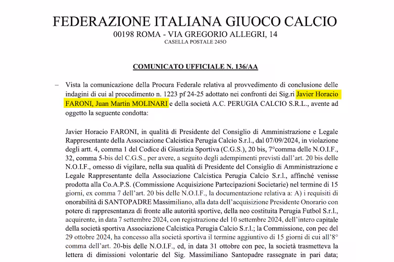 La presencia de las firmas Sports NextGen Ltd, del Reino Unido, y Beagle Capital Management LLC, de Estados Unidos, como controlantes del Perugia aparece de manera explícita en un comunicado oficial que la Federación Italiana de Fútbol emitió el 12 de septiembre de este año para comunicar que había aplicado sanciones al club y a dos directivos, Faroni y Molinari, a quienes les impuso tres meses y 15 días de inhabilitación.