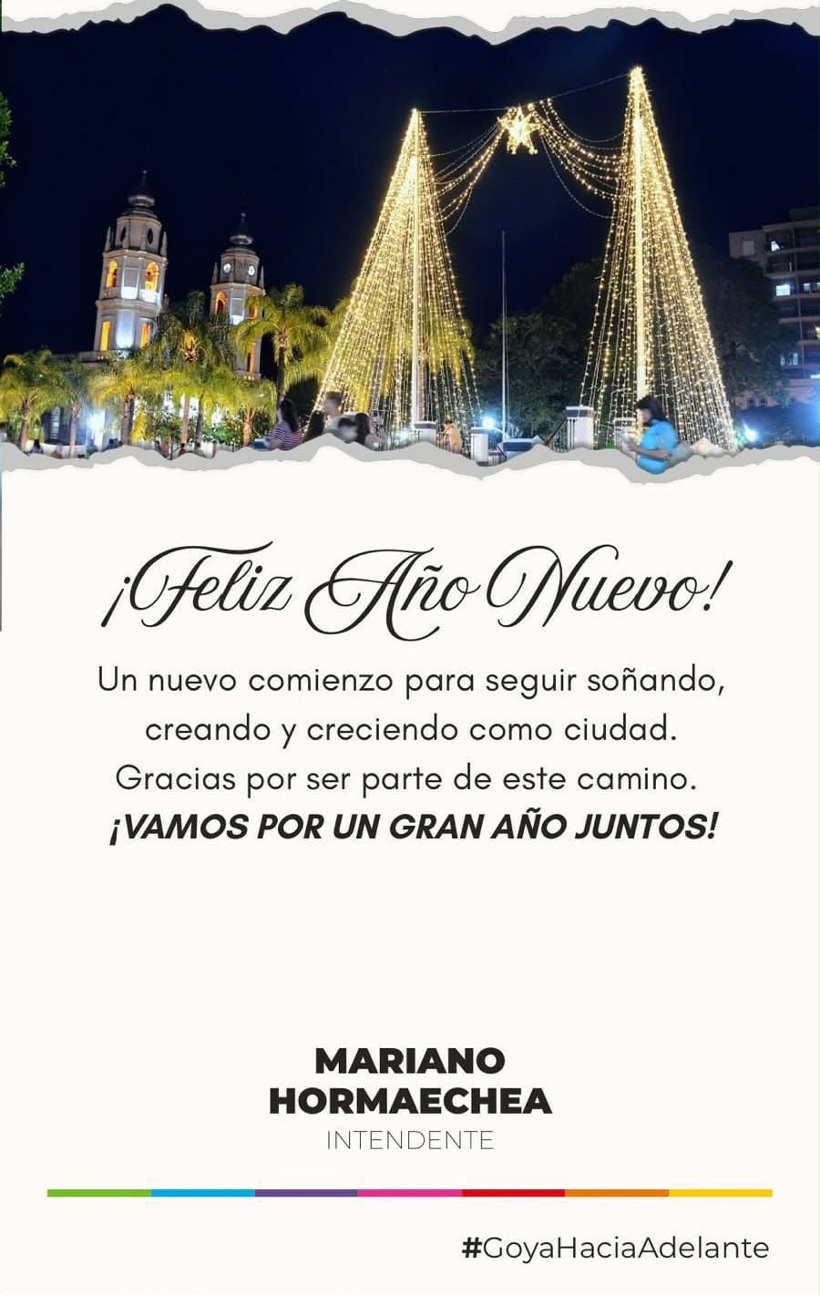 El Departamento Ejecutivo Municipal, hace llegar un afectuoso saludo a nuestros vecinos del campo y la ciudad, deseándoles lo mejor en el año que comenzamos a transitar. Reconociendo haber cumplido objetivos y superado momentos y situaciones contribuyendo en equipo a lograr resultados de superación, a las mujeres y hombres comprometidos con Goya.