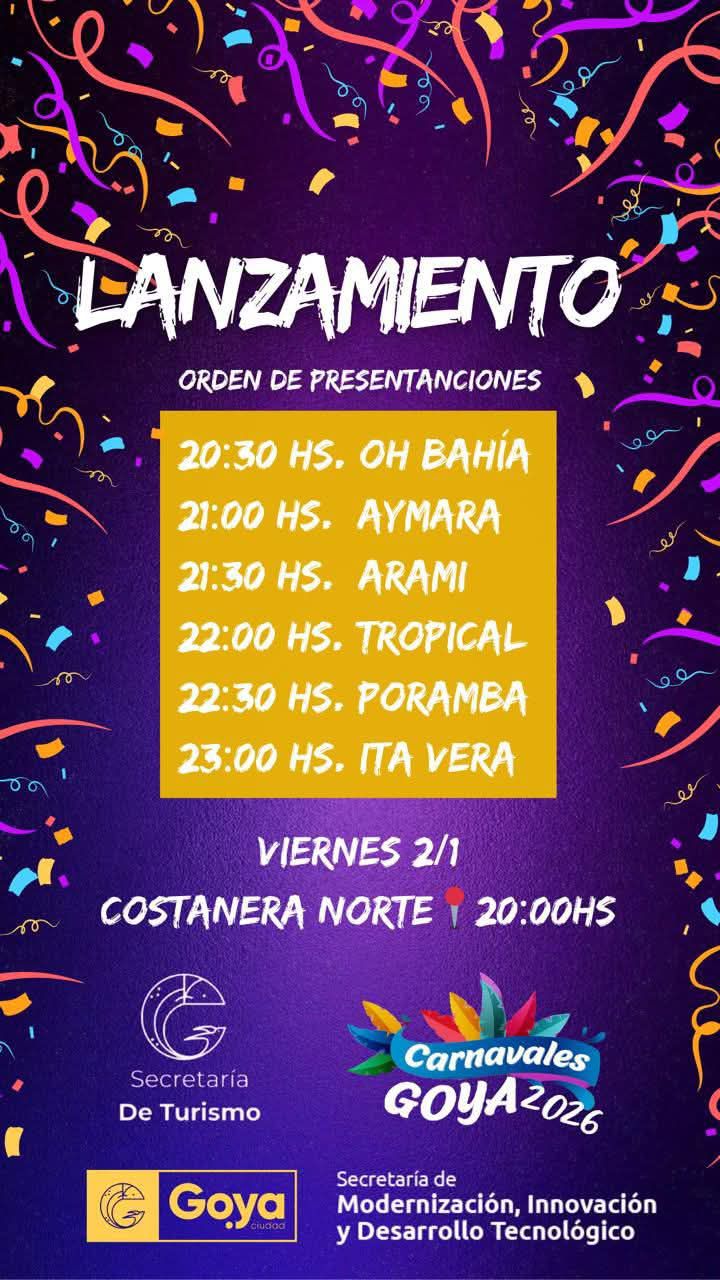 La invitación está cursada para el viernes a las 20 horas en Costanera Norte, Playa El Inga con entrada libre y gratuita anticipando las lunas carnavaleras de Goya, con la presencia de las 6 comparsas que animarán la fiesta de Momo 2026.