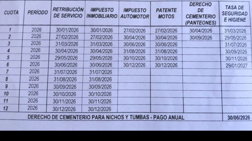 Vencimientos del calendario de: Impuesto: Automotor; Impuesto Inmobiliario; Retribución de Servicios; Patente motos, Tasa de Seguridad e Higiene, Derecho Cementerio año 2026
