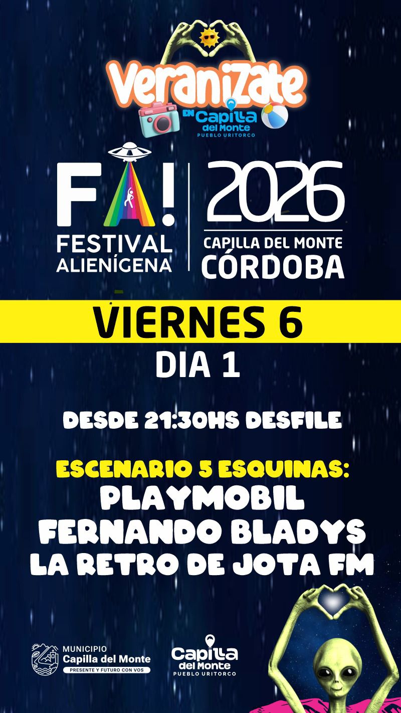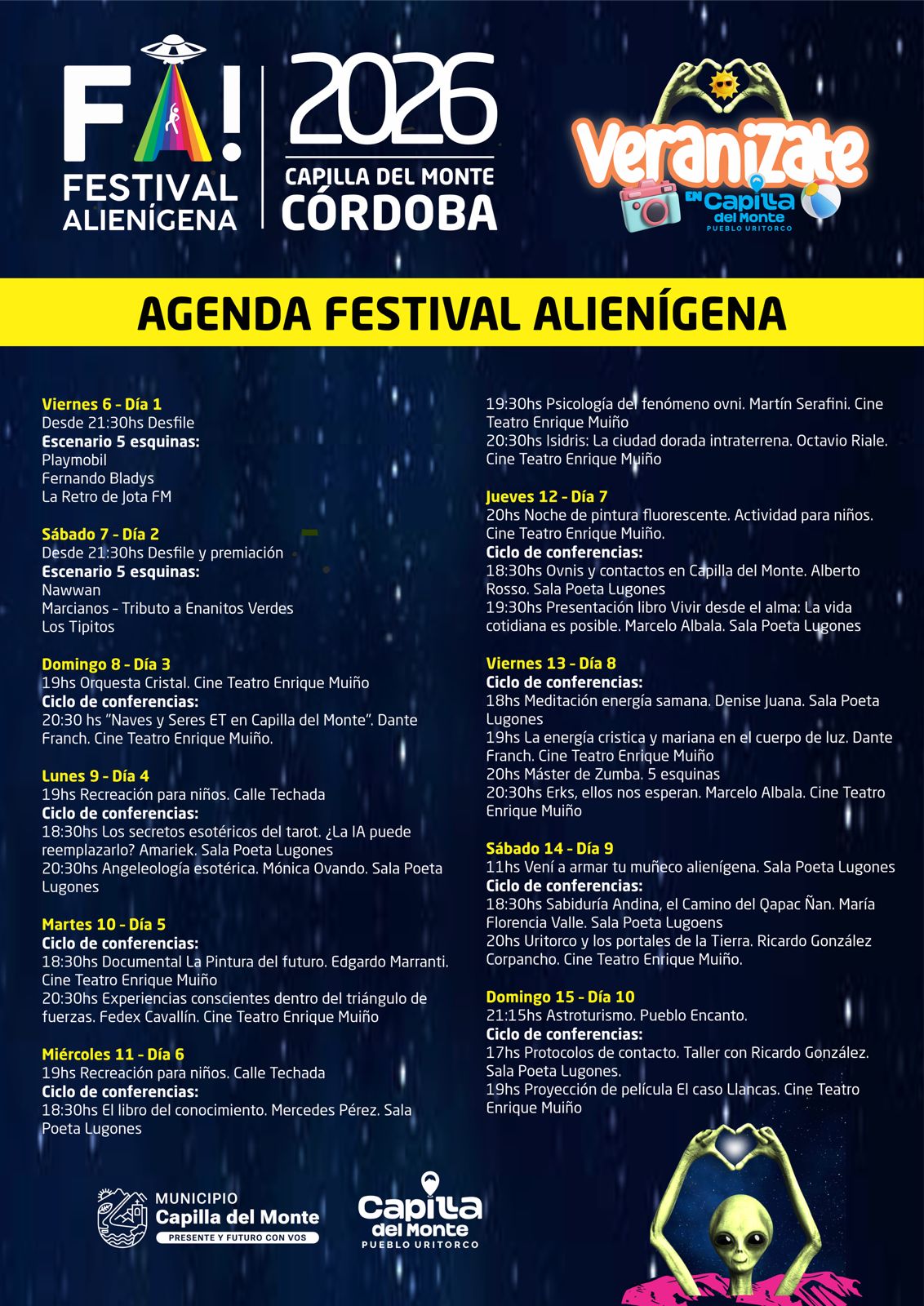 El Festival Alienígena 2026 en Capilla del Monte se celebrará del 6 al 14 de febrero, convirtiendo a la ciudad en el epicentro de la temática ufológica y mística. Esta semana temática incluye el famoso desfile de disfraces, conferencias, ferias y actividades nocturnas, destacando el astroturismo.