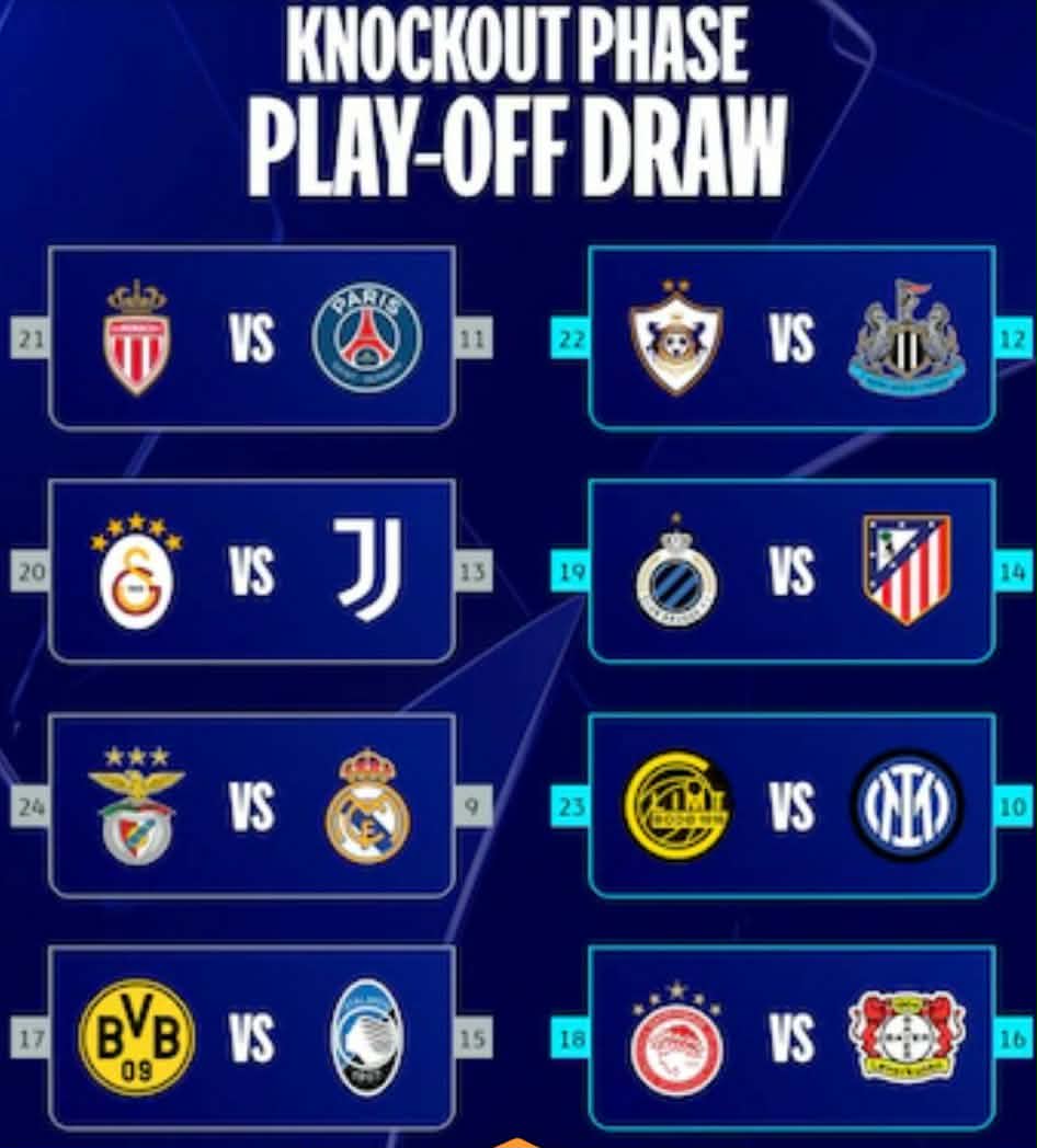 La gala, que se desarrolló en la Casa del Fútbol Europeo en Nyon, Suiza, determinó cómo se repartieron las bolillas. El primer emparejamiento puso cara a cara al Borussia Dortmund de Alemania con el Atalanta, por lo que Olympiakos de Grecia se verán las caras contra el Bayern Leverkusen. Los vencedores de estas llaves se medirán en octavos de final (el sorteo será el 27 de febrero) ante Arsenal de Inglaterra o Bayer Munich de Alemania.