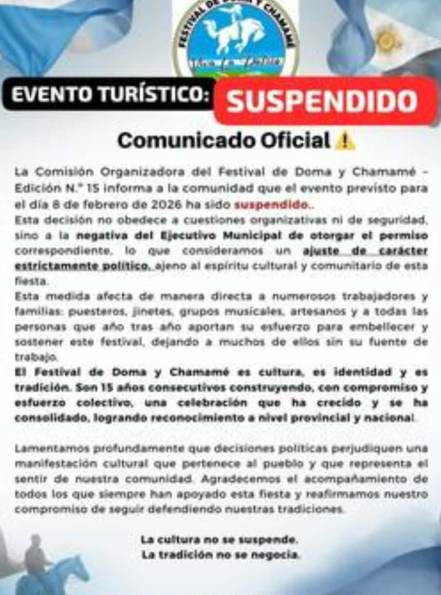 El comunicado, difundido a través de redes sociales, cuestiona al actual gobierno municipal encabezado por el intendente Edgar Galarza Florentin y el viceintendente Sebastián Guastavino Calathaki, y detalla que la medida afecta de manera directa a numerosos trabajadores y familias, entre ellos puesteros, jinetes, músicos, artesanos y equipos técnicos, muchos de los cuales se quedan sin su fuente de ingresos.