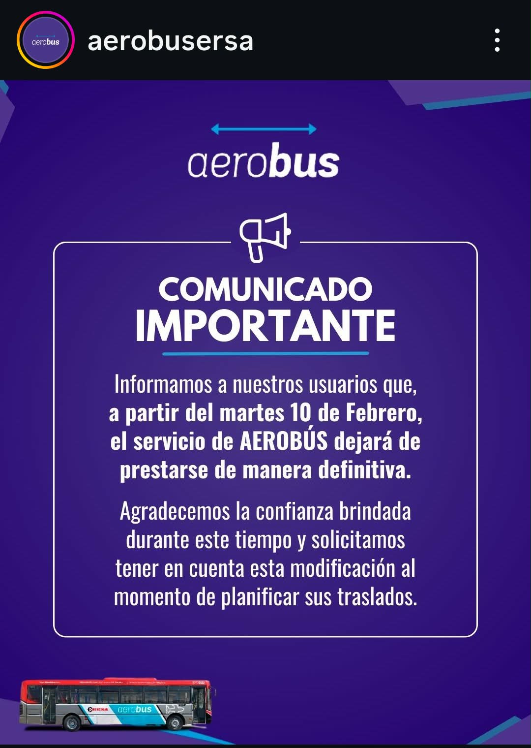 La firma indicó que la decisión implica el cierre total del servicio y agradeció a los usuarios por la confianza brindada durante el tiempo de funcionamiento. También solicitó tener en cuenta la modificación al momento de planificar traslados.