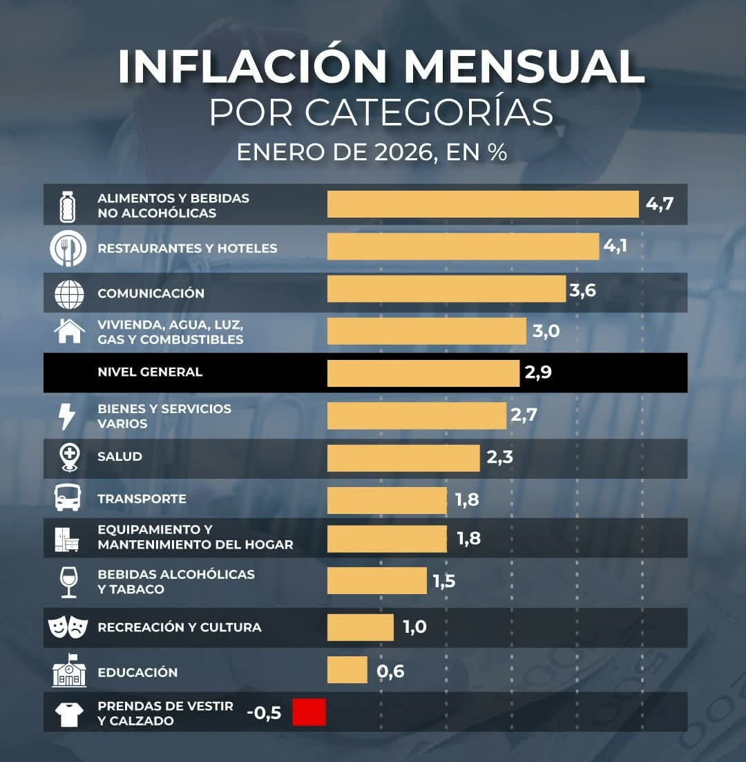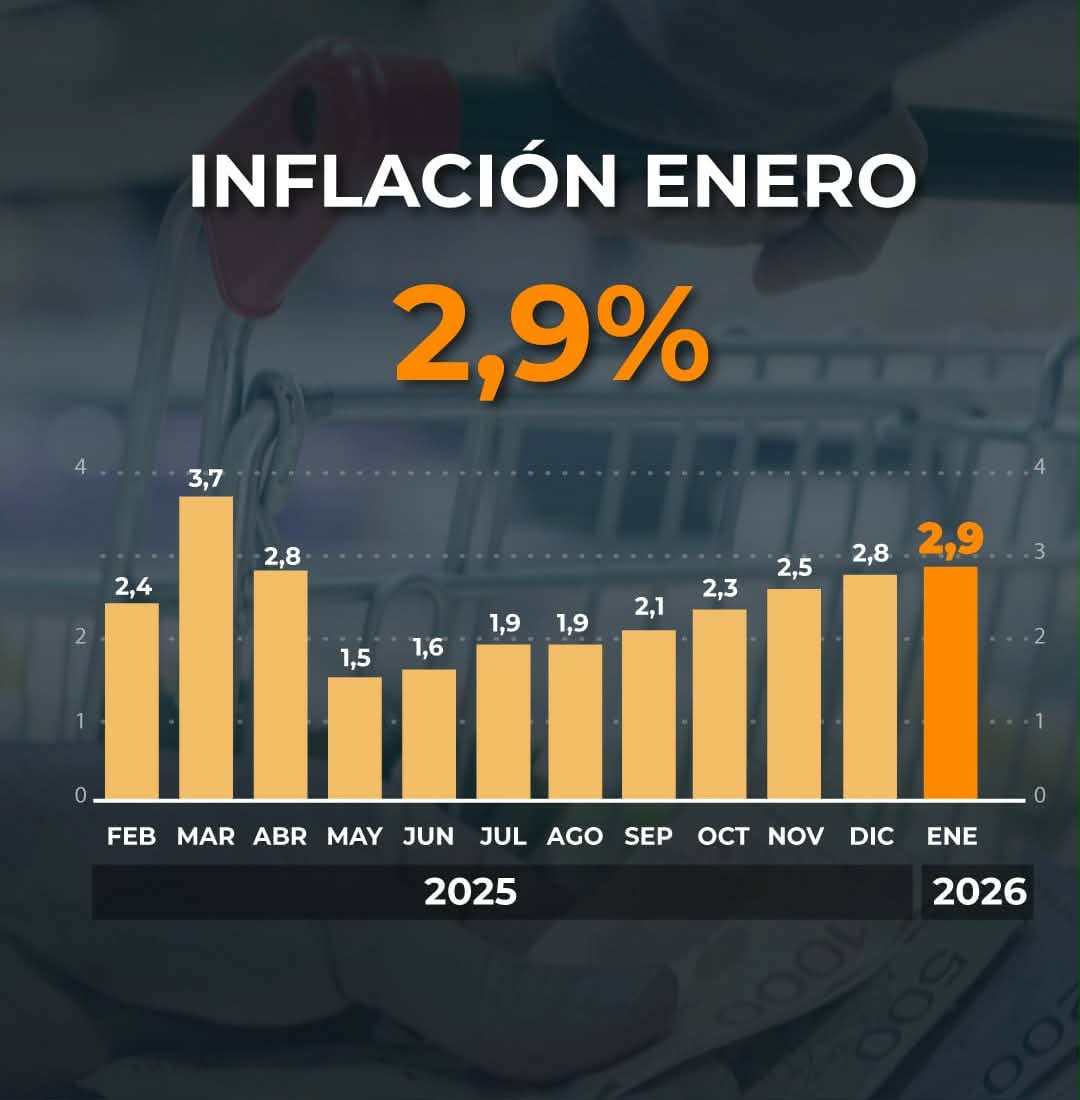 La inflación en enero de 2026 alcanzó 2,9%, según el Instituto Nacional de Estadística y Censos (Indec), lo que implicó una variación interanual de 32,4 por ciento. El dato se publicó en medio de los cuestionamientos tras la salida de Marco Lavagna del organismo y la decisión de postergar la nueva fórmula, que significaba la actualización de la canasta de consumos prevista para este mes.