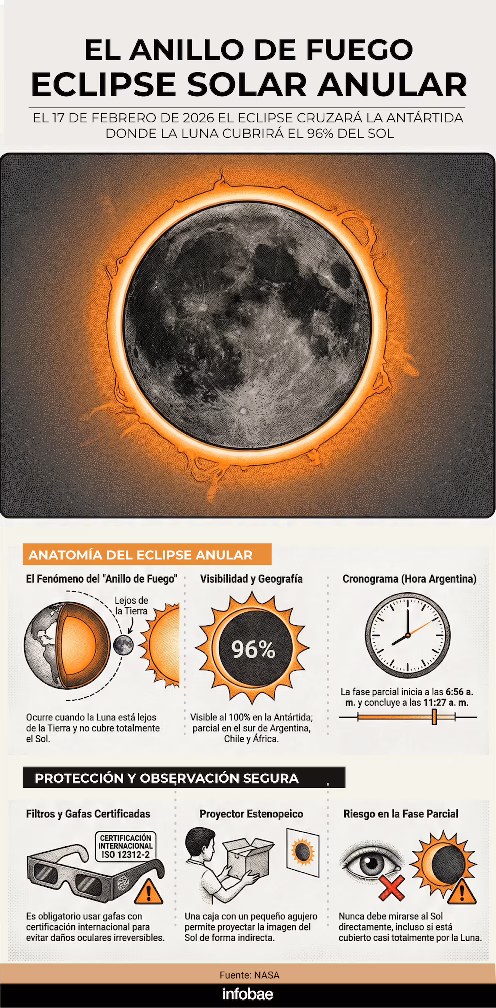 El cielo antártico fue escenario de un espectáculo astronómico singular: un eclipse solar anular que forma el característico “anillo de fuego” cuando la Luna pase frente al Sol y deje visible solo un delgado aro de luz.