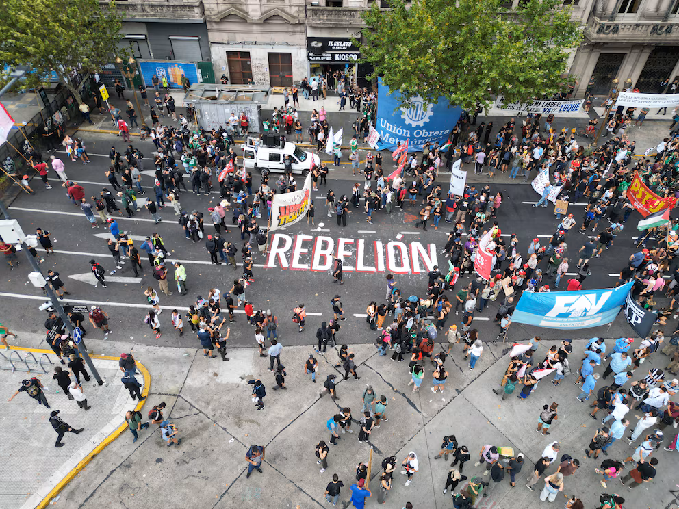 Las columnas de sindicatos docentes de diferentes niveles, junto con trabajadores del Hospital Garrahan, se destacaron por la fuerza de sus consignas al ingresar a la plaza, donde manifestaron su rechazo a la aprobación de la reforma laboral. En el sector de Hipólito Yrigoyen se observó una presencia limitada de organizaciones peronistas, representadas por dos banderas de la Unión de Obreros Metalúrgicos—una con la imagen de José Ignacio Rucci y otra con un abrazo entre Perón y Eva—y una columna reducida de Barrios de Pie.