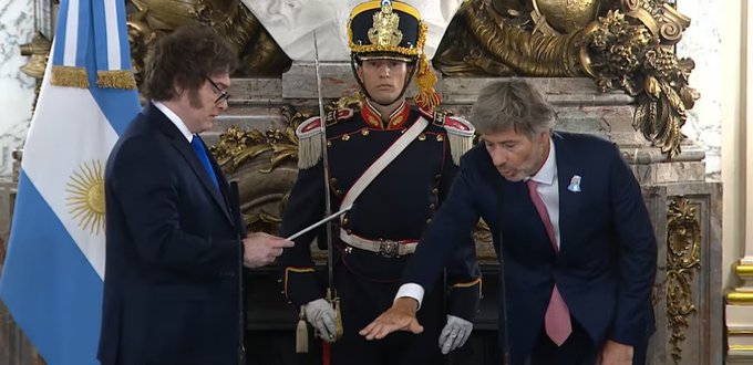 De la ceremonia participaron integrantes del gabinete nacional y familiares del flamante funcionario. También estuvo presente Cúneo Libarona, quien saludó al Presidente y a su sucesor tras la jura.