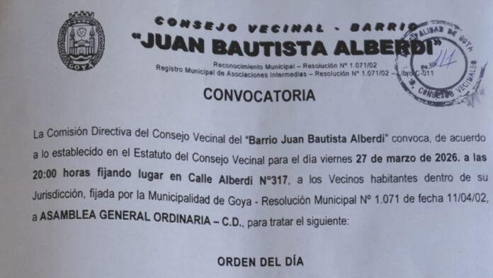 La Comisión Directiva del Consejo Vecinal del “Barrio Juan Bautista Alberdi” convoca, de acuerdo a lo establecido en el Estatuto del Consejo Vecinal para el día viernes 27 de marzo de 2026. a las 20:00 horas fijando lugar en Calle Alberdi N° 317, a los Vecinos habitantes dentro de su Jurisdicción, fijada por la Municipalidad de Goya – Resolución Municipal N° 1.071 de fecha 11/04/02, A ASAMBLEA GENERAL ORDINARIA – C.D. para tratar el siguiente: