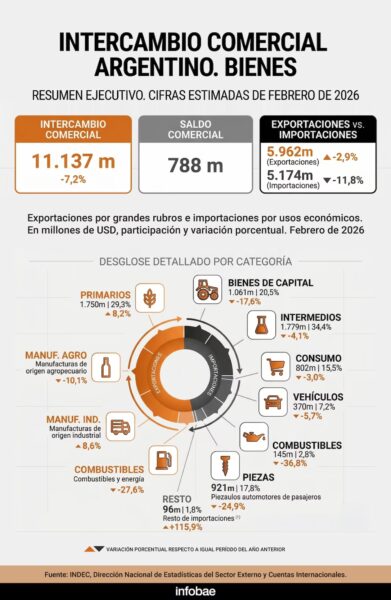 Según informó el Indec, las importaciones entre enero y febrero alcanzaron los USD 10.231 millones, cifra que implicó una caída de 11,9% respecto del mismo período del año pasado, cuando habían llegado a USD 11.617 millones. Por el contrario, las exportaciones vienen en alza y es por eso que el superávit pasó de USD 438 millones en el primer bimestre de 2025 a USD 2.977 millones este año.
