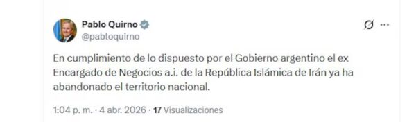 “En cumplimiento de lo dispuesto por el Gobierno argentino el ex Encargado de Negocios a.i. de la República Islámica de Irán ya ha abandonado el territorio nacional”, confirmó el canciller Pablo Quirno.