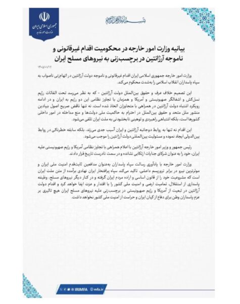 Esta vez, la respuesta de al República Islámica, a través de su representación diplomática en Uruguay, incluyó una advertencia hacia la Argentina. En el texto, difundido en las últimas horas, Teherán afirmó que “condena enérgicamente la acción ilegal e injustificada del gobierno argentino” y sostuvo que se trata de “una ofensa imperdonable al pueblo iraní”. “Esta decisión […] genera responsabilidad internacional para el Estado argentino”, señaló el comunicado.