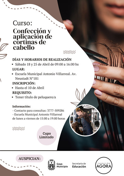 En el marco de las políticas de formación continua impulsadas por la gestión municipal, a través de la Secretaría de Educación, se presentó una nueva propuesta destinada al sector de la estética. Se trata del “Curso de Confección y Ampliación de Cortinas de Cabello”, organizado por la Fundación Ágora y auspiciado por el municipio, que se desarrollará los sábados 18 y 25 de abril, de 9 a 16 horas, en la Escuela Municipal Antonio Villarreal, ubicada en Avenida Neustadt N° 181.
