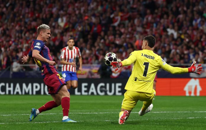 Estaba en el aire la sensación de que el Colchonero se había quedado corto con el 0-2 de la ida frente a un rival con mucho poder ofensivo. Esos pensamientos se corroboraron a los tres minutos con un grosero error defensivo de Clément Lenglet. El zaguero central, con pasado en Barcelona, buscó dar un pase atrás a Juan Musso, lo anticipó Lamine Yamal, la pelota le quedó a Ferrán Torres, quien se la devolvió a Yamal y el 10 definió entre las piernas de Musso para dejar al Blaugrana a un tanto de igualar la serie.