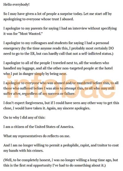 En este contexto, el FBI y el Servicio Secreto recuperaron otro manifiesto que contenía una retorcida prosa anti-Trump y anticristiana.