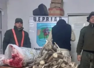 Fue demorado con astas de ciervo, y bolsas con carne de cordero y de...